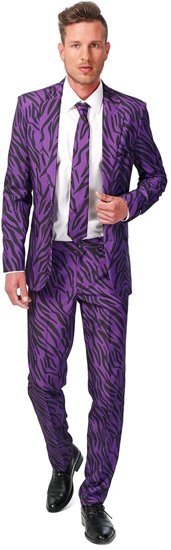 Paarser dan paars, maar niet minder gevaarlijk. Met deze Pimp Tiger van Suitmeister ben jij de best geklede man van de feesttent. Gepast, maar toch ook feestelijk. Suitmeister maakt zijn naam als echte partymeister weer helemaal waar met deze Pimp Tiger. Brul en grom je een weg in de polonaise. Graaaawwwww!