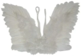 Schattige engelenvleugels van witte veren voor kinderen. De vleugels zijn 30 centimer hoog en 45 centimeter breed.