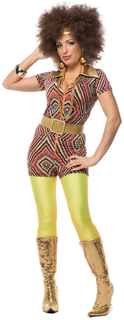Mooie catsuit met een hippy retroprint erop met gekleurde ruiten en lijnen. Dit kostuum heeft hele mooie gouden details.