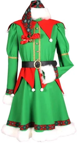 Details jurk: aan de kraag en taille rode punten met witte bolletjes. Mouw en onderaan jurk imitatie bont, galon en leuke biezen in een kerst design