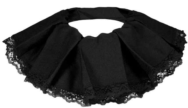 Een zwarte geplooide pietenkraag, afgewerkt met kant. De kraag is gemaakt van trevira stof en is elastisch.