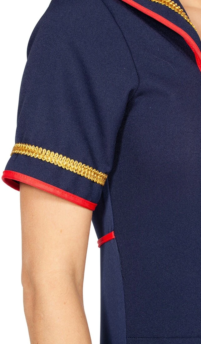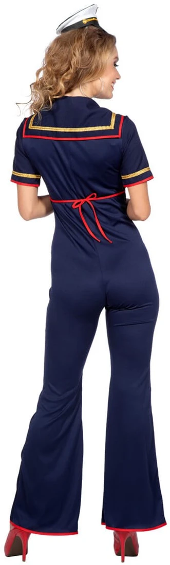 Details: de jumpsuit is afgewerkt met rood, goud band en knopen op de buik