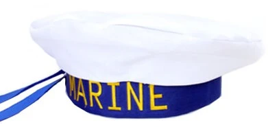 Matrozenhoed met een blauw/wit ontwerp en de gele tekst “MARINE” aan de voorkant.