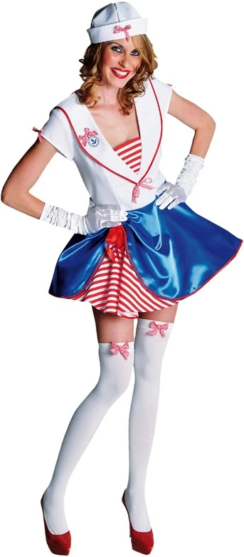 Details: matrozen kraag met een embleem erop. Glimmende rok die aan 1 kant is opgehaald