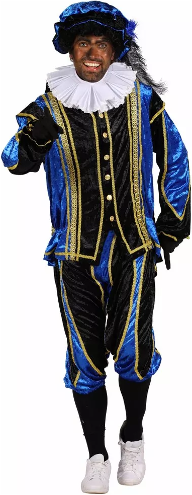 Een prachtig zwart/blauw pietenpak dat gemaakt is van velours de panne. Het kostuum is afgezet met een gouden gallon band en is verkrijgbaar in meerdere kleuren. Dit pietenpak bestaat uit:
