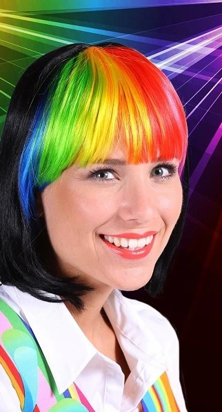 Mooie boblijn pruik zwart/multi Lola Luxe voor dames. Kort model met pony om bijvoorbeeld uw hippie of disco outfit compleet te maken. De pruik is verstelbaar voor een goede pasvorm en gemaakt van kanekalon fiber (hoogwaardig en realistische kwaliteit). In meerdere kleuren verkrijgbaar.