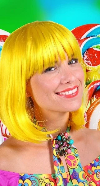 Deze halflange boblijn pruik Samantha Luxe in de kleur geel is voor de dames. Halflang model met pony om bijvoorbeeld uw hippie of disco outfit compleet te maken. De pruik is verstelbaar voor een goede pasvorm en gemaakt van kanekalon fiber (hoogwaardig en realistische kwaliteit). In meerdere kleuren verkrijgbaar.