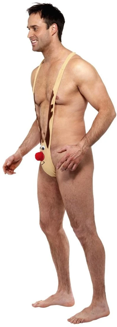 Een gave mankini met het gezicht van Rudolph the red nosed reindeer. Ga in deze Rudolf kini gekleed en alle ogen zijn tijdens kerst op jou gericht.