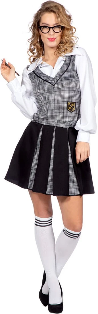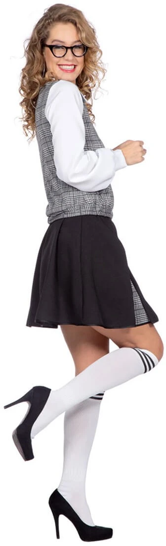 Details: blouse en spencer zitten aan elkaar vast. de rok heeft aan de voorkant plooien
