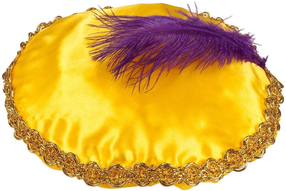 Details: er zit een veer op en is afgezet met een rand van goud galon. De barret heeft een satijn look